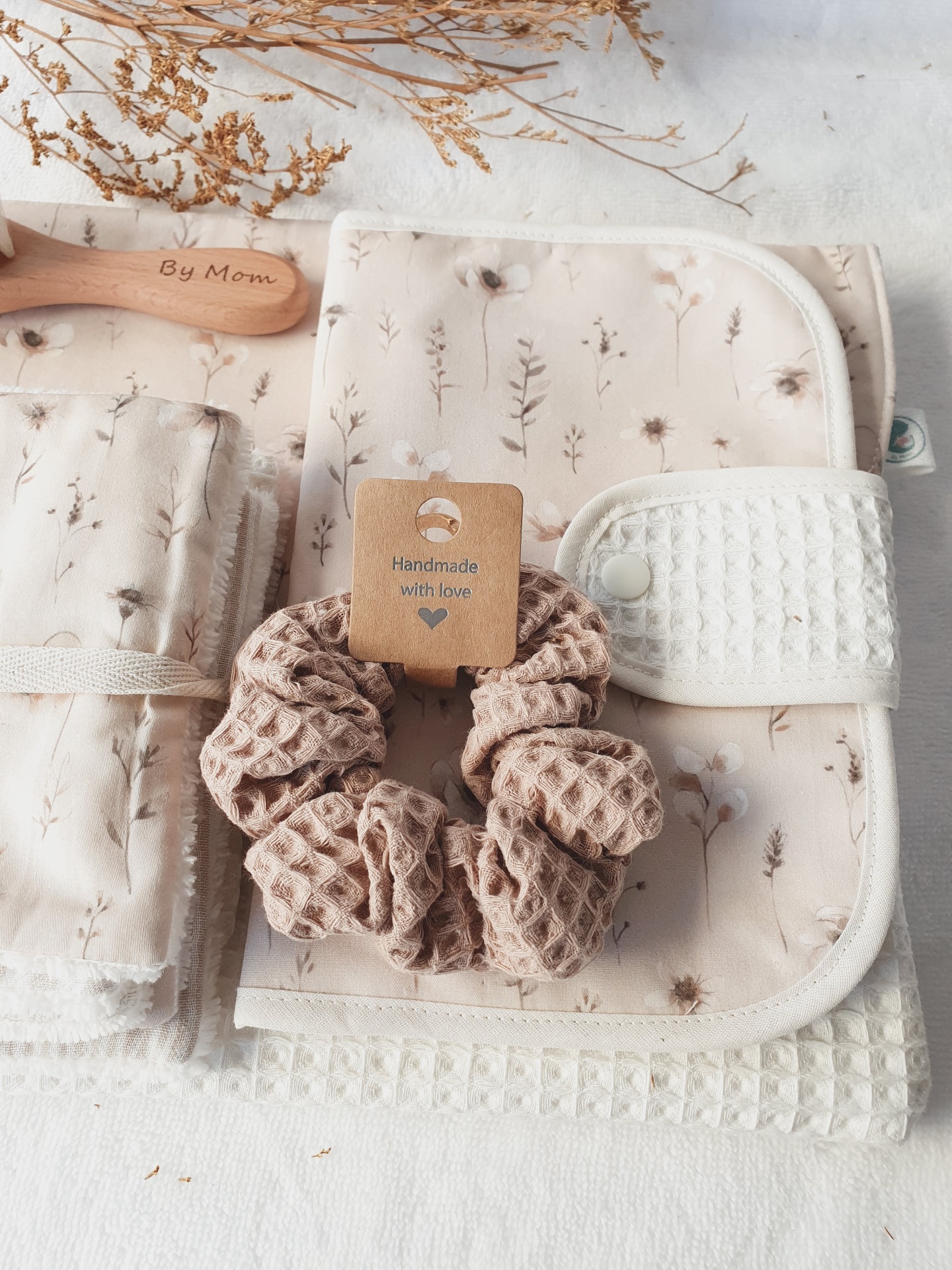 • Conjunto de acessórios de bebé em tecido com bolsa floral, scrunchie bege e escova de madeira