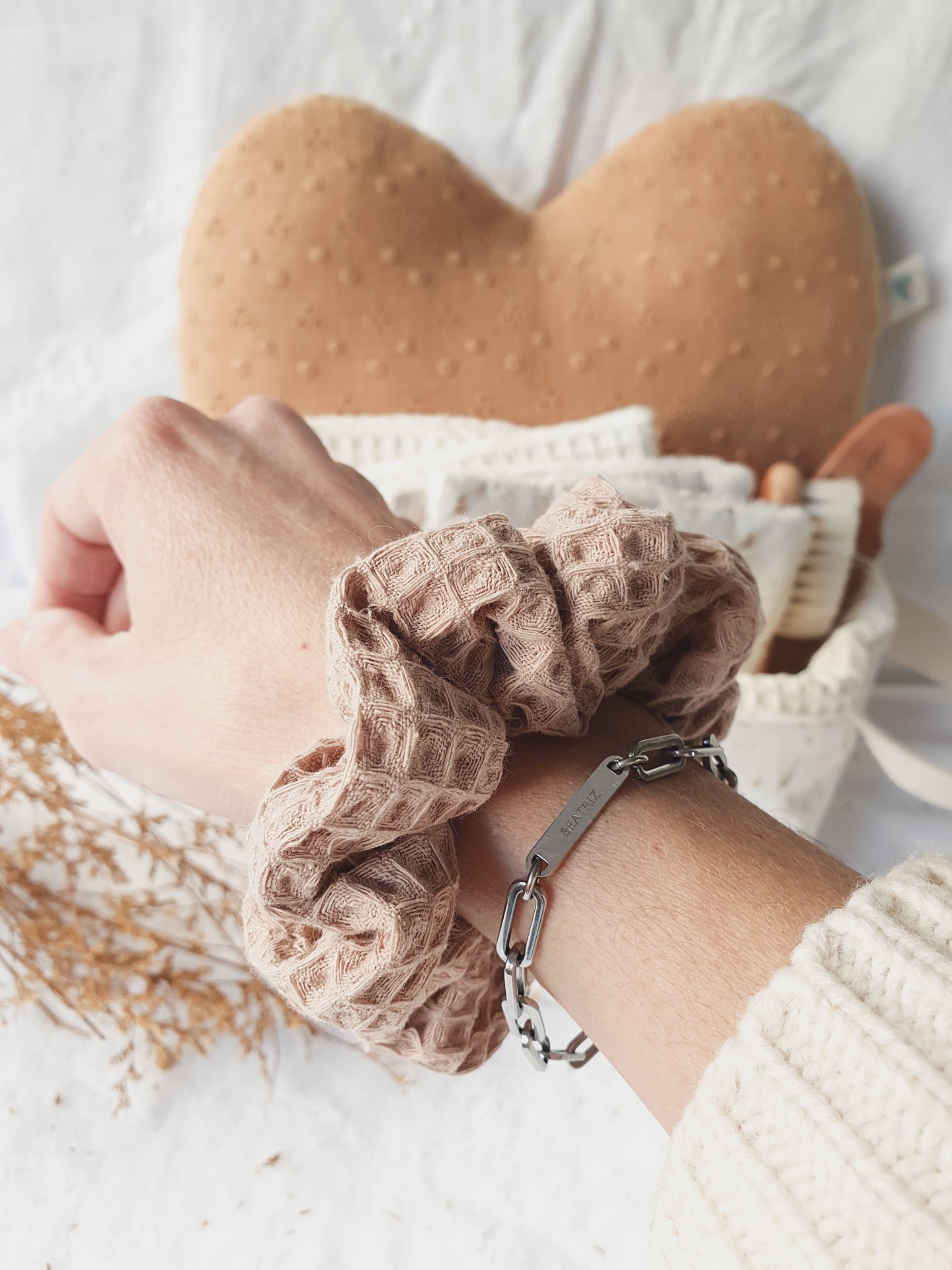 • Mão com scrunchie bege texturizado e pulseira metálica prateada em fundo branco com almofada castanha