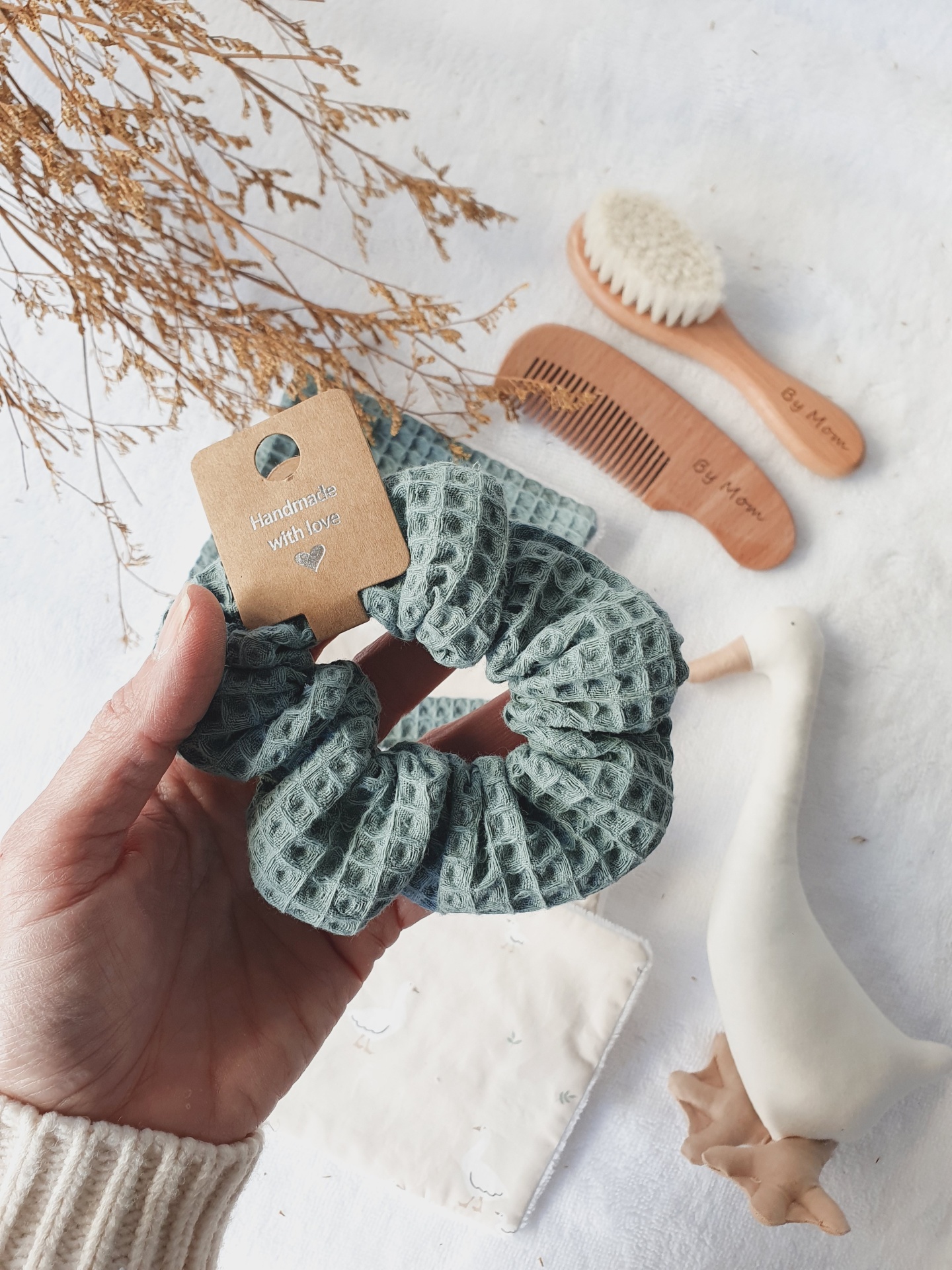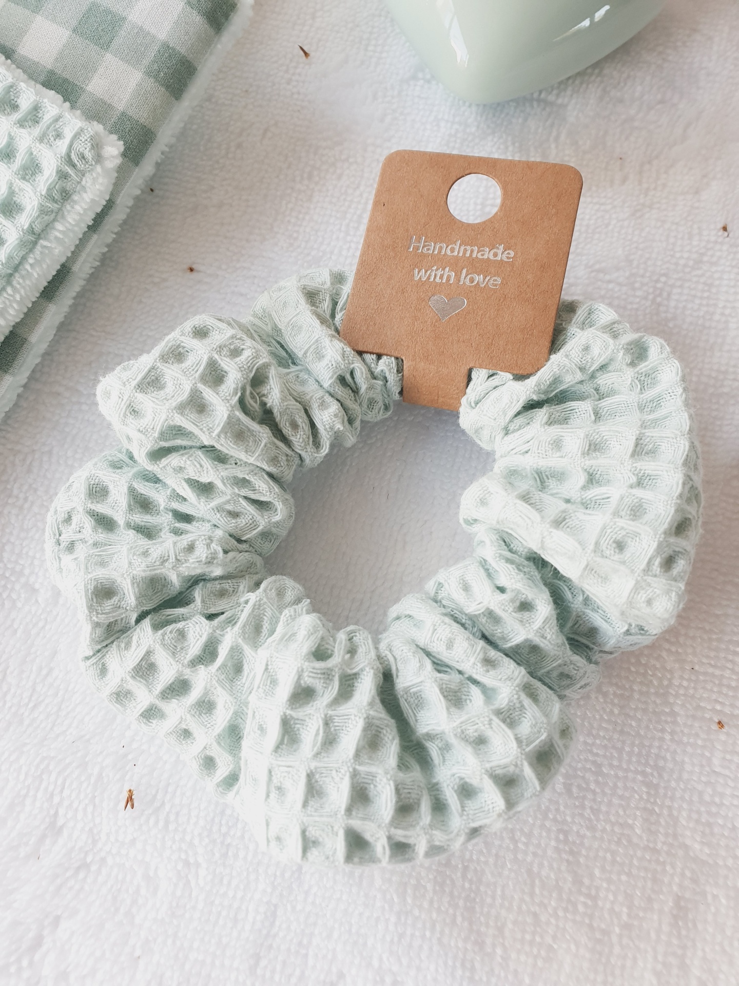 • Elástico de cabelo verde-claro com padrão texturizado e etiqueta 'Handmade with love'