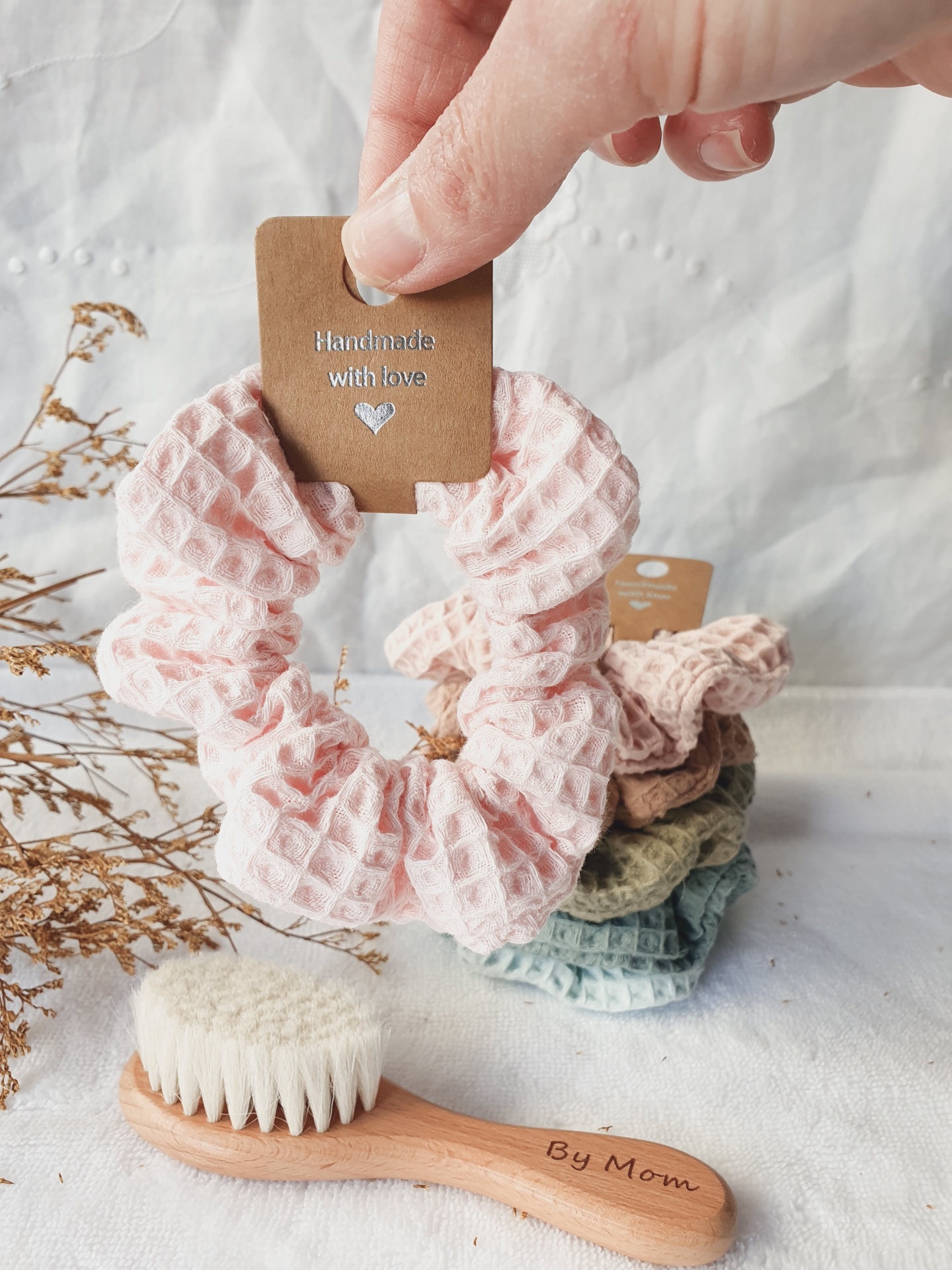 • Elástico de cabelo rosa com textura e etiqueta 'Handmade with love', escova de cabelo de madeira com texto 'By Mom' e outros elásticos em fundo branco.
