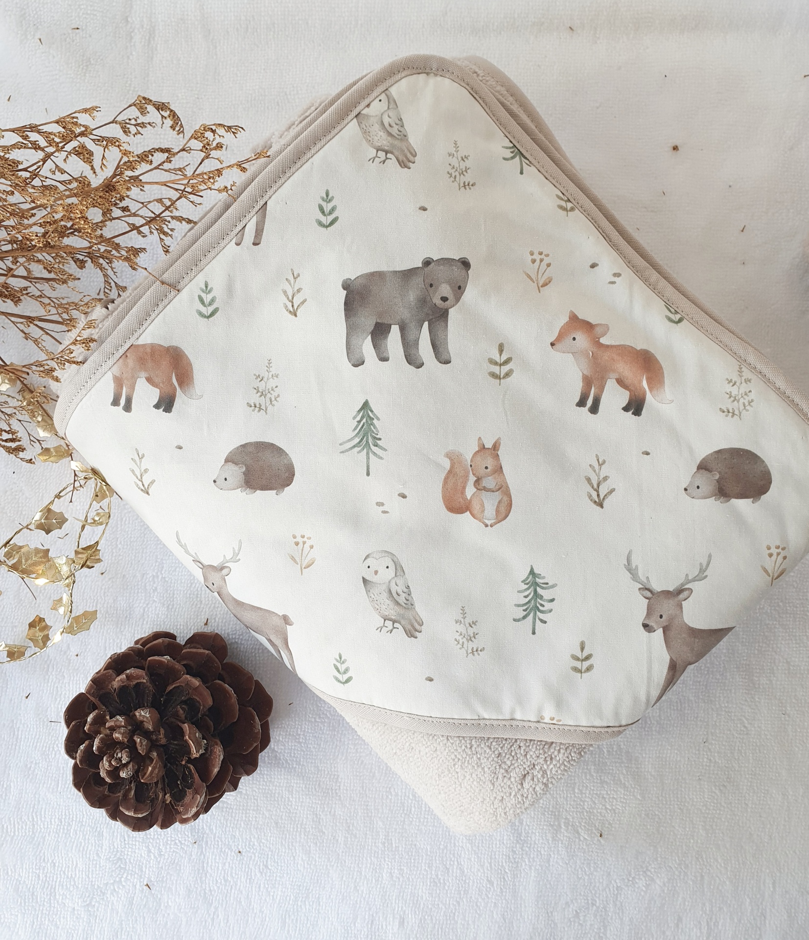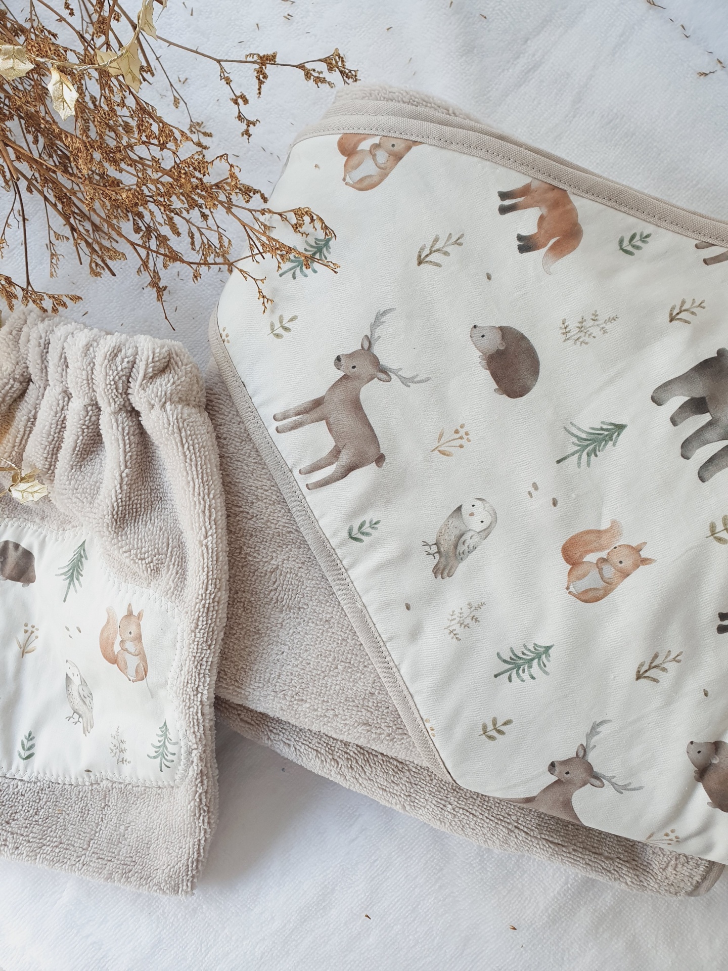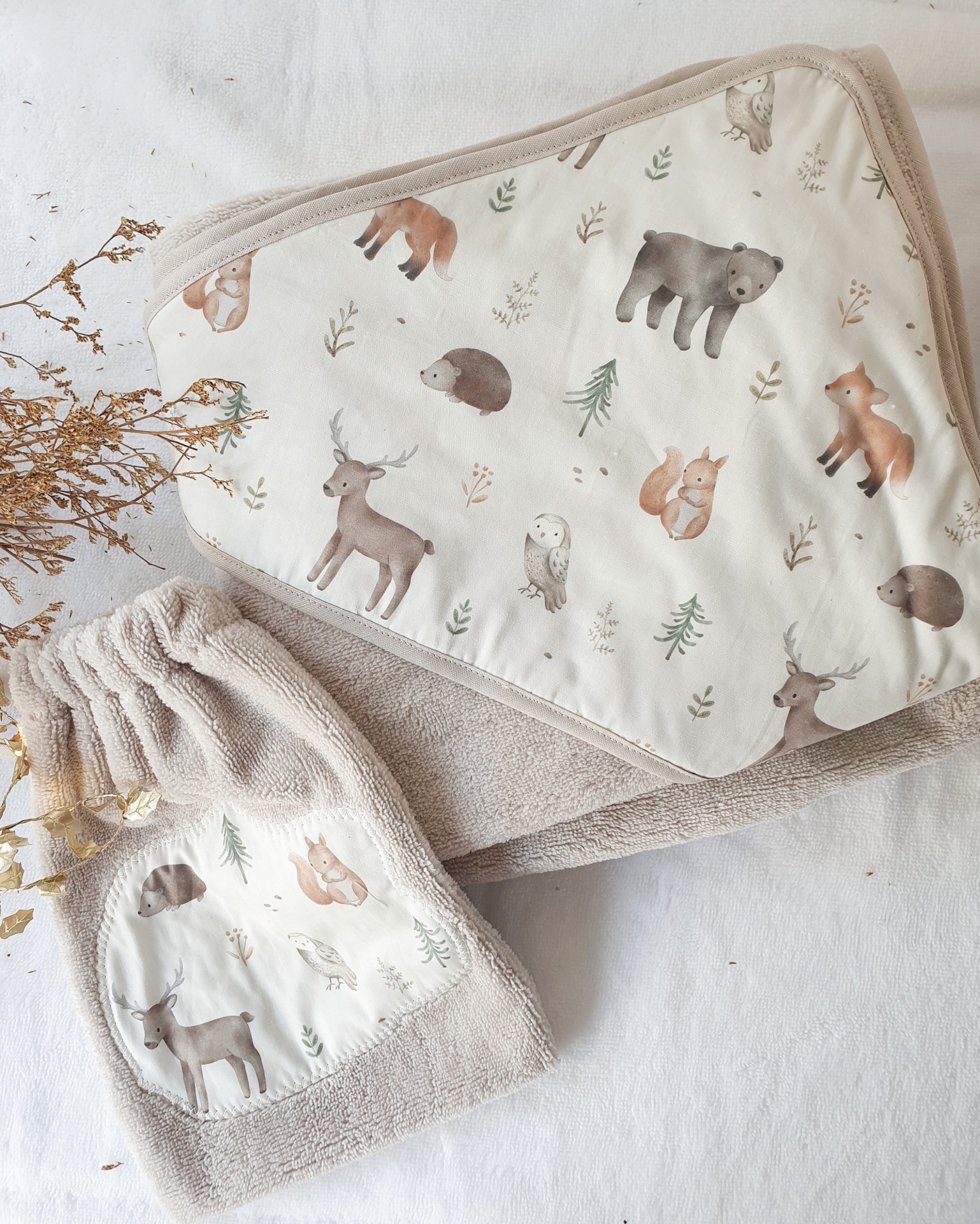 • toalha e saco para bebé com estampado de animais da floresta em tecido bege e branco