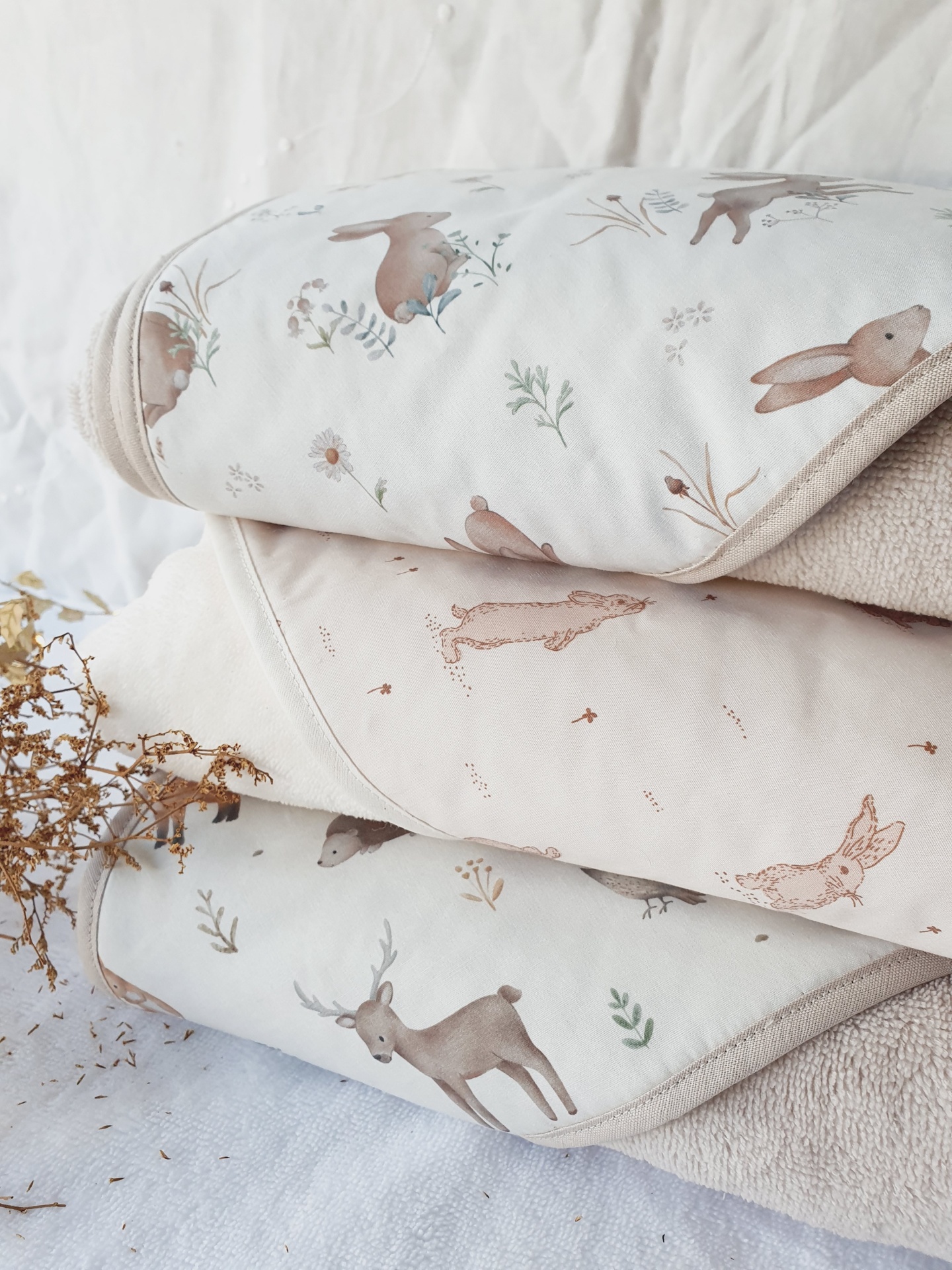 • Três mantas para bebés com estampados de animais e plantas empilhadas sobre superfície branca.