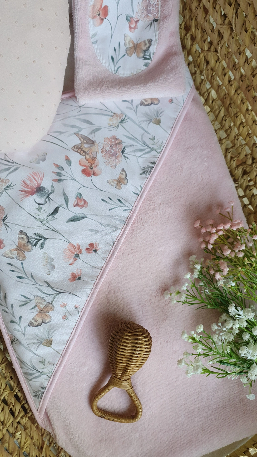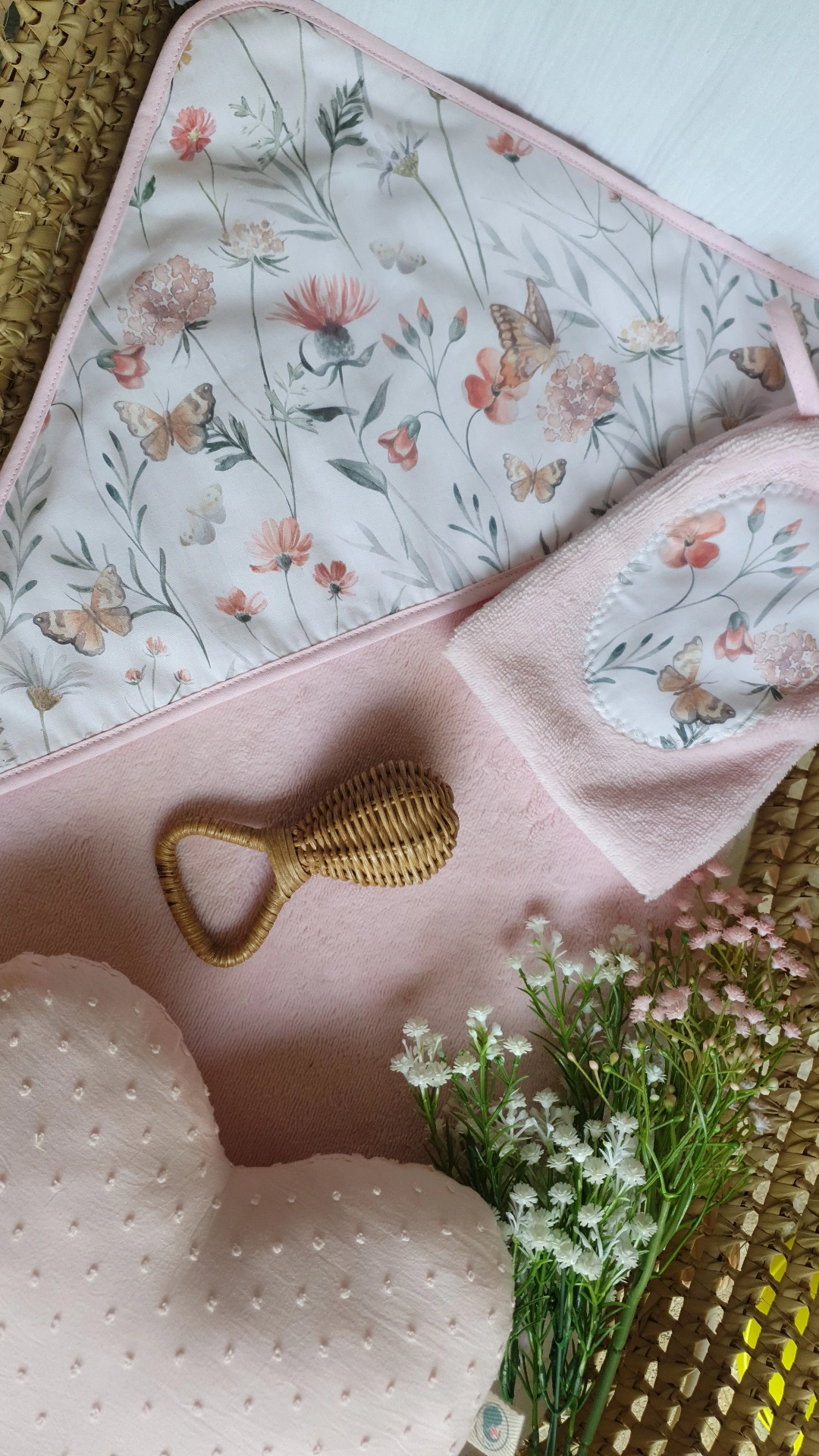 • Toalha rosa clara com padrão floral e borboletas, luva estampada e brinquedo em cesta de fibra natural.