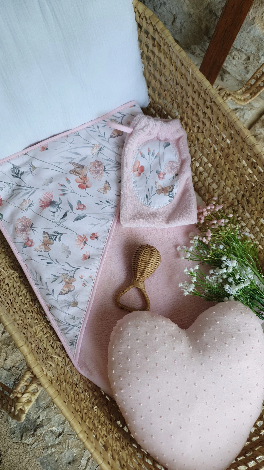 • Conjunto de artigos de bebé com padrão de flores e borboletas, almofada em forma de coração e chocalho em vime