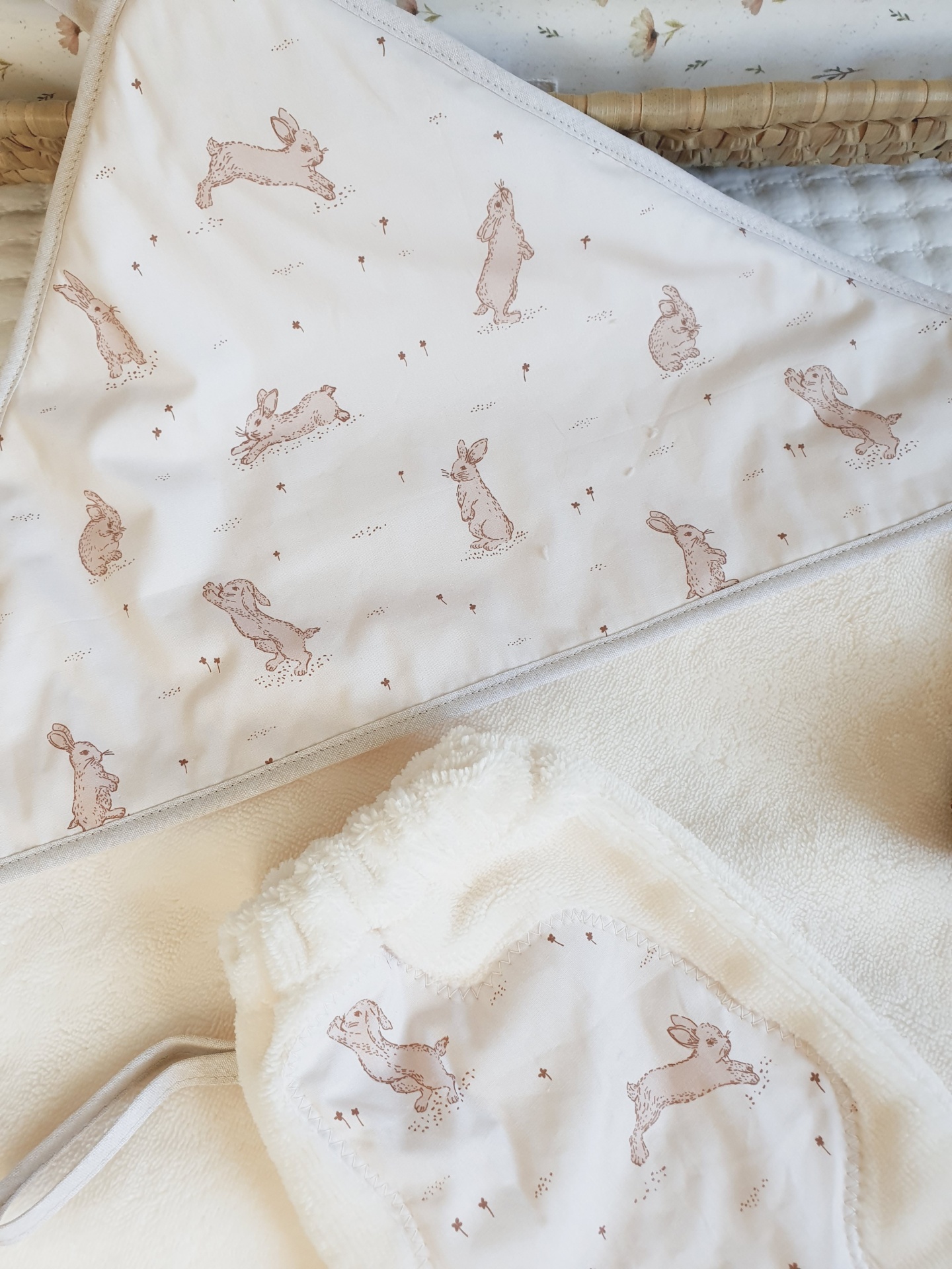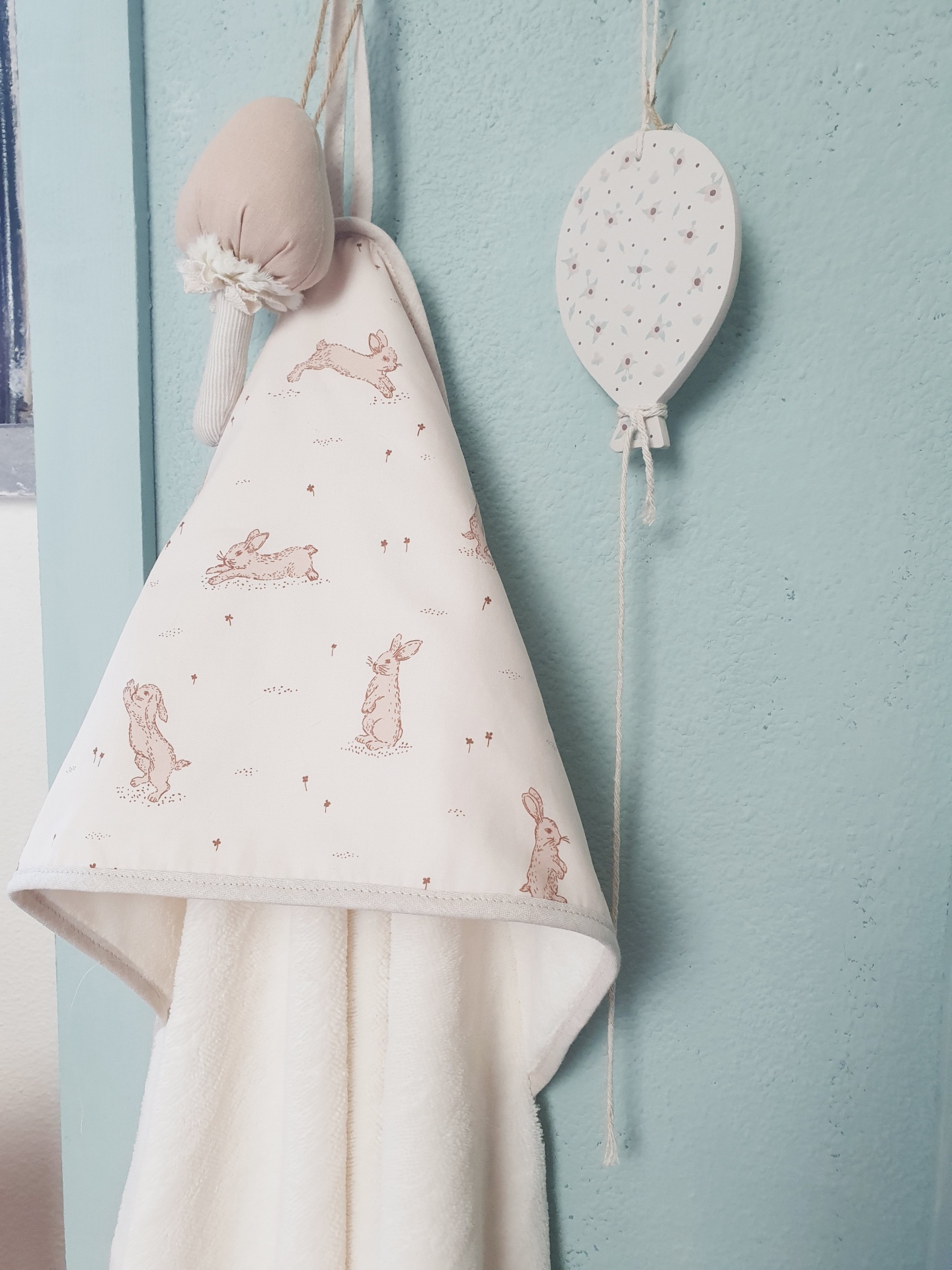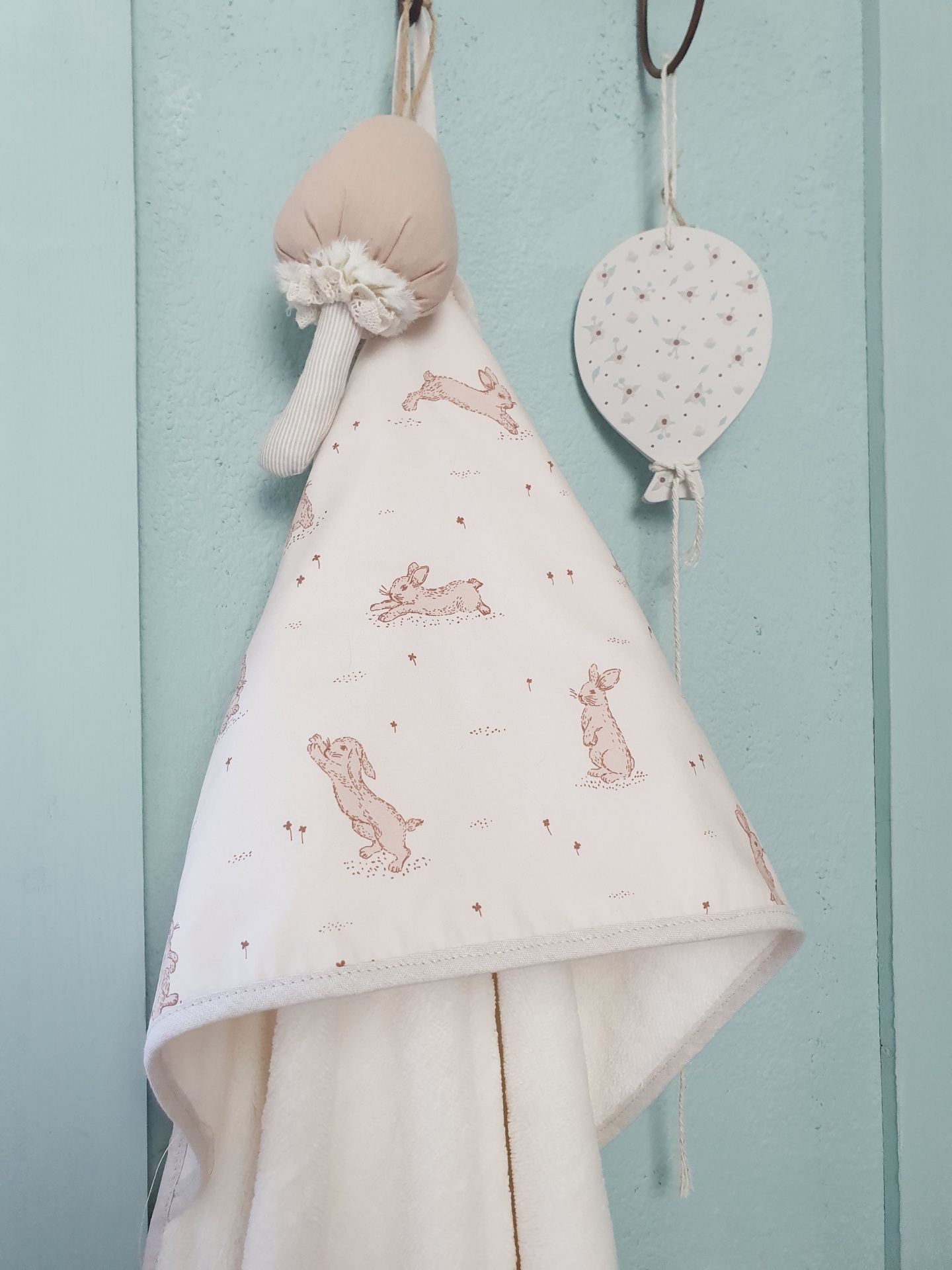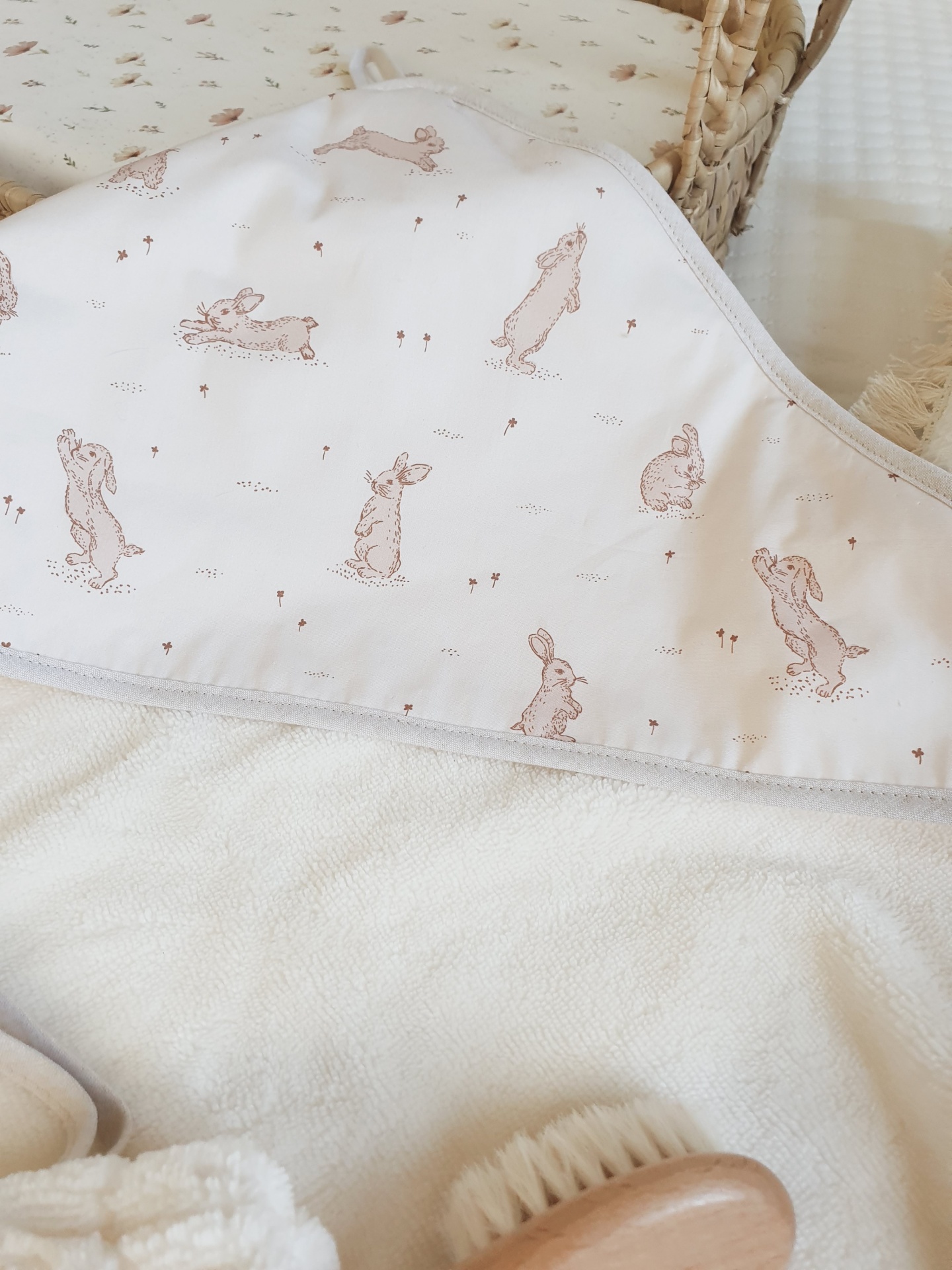 • Toalha capuz branca com padrão de coelhos castanhos e bege