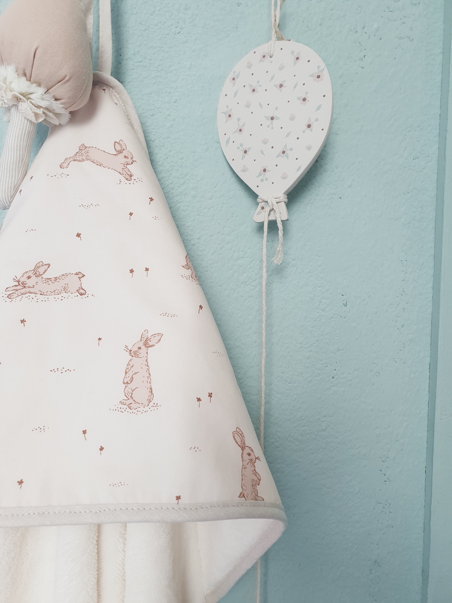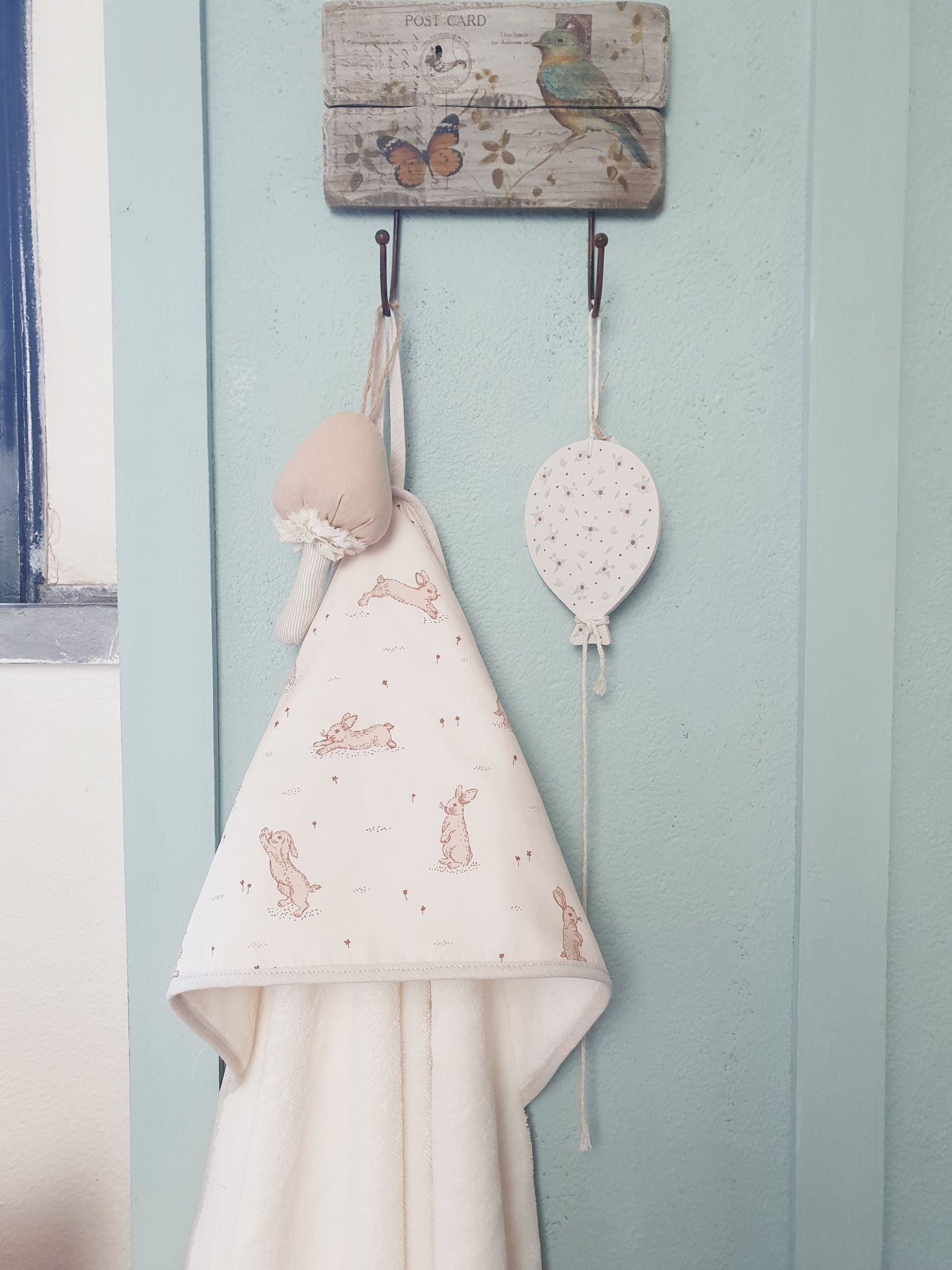 • Toalha de banho com capuz estampado de coelhos pendurada numa parede azul com balão decorativo
