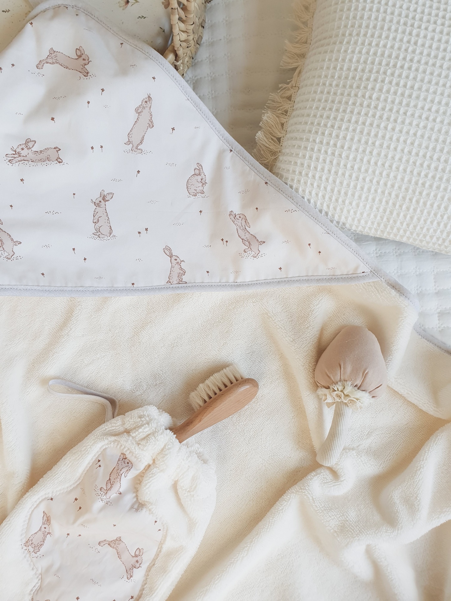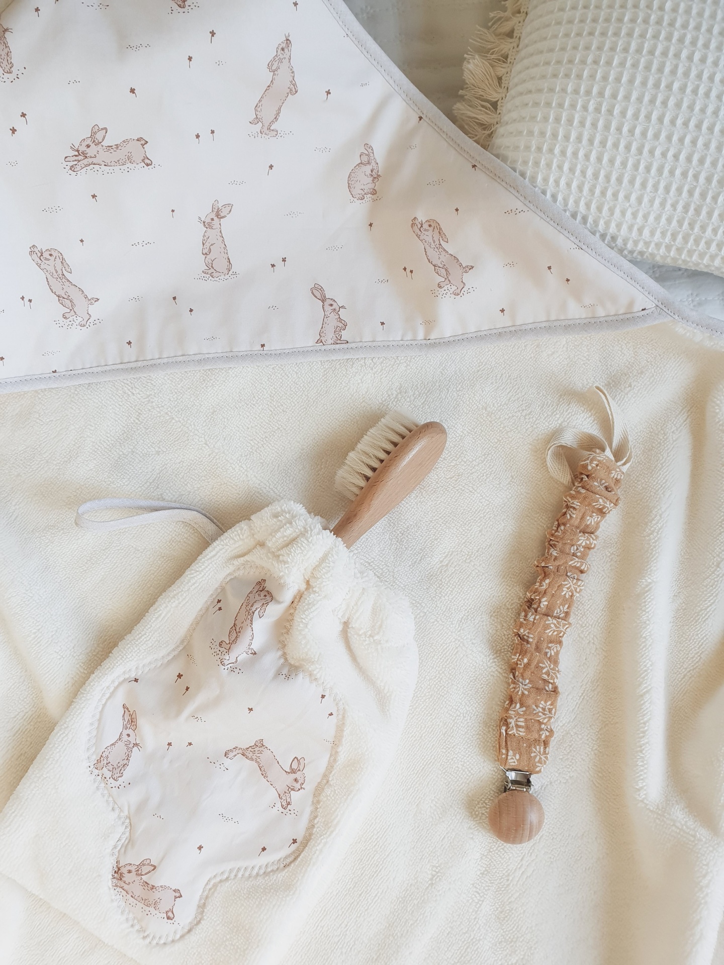 • Toalha de bebé com padrão de coelhos, escova de cabelo de madeira e saco de tecido sobre tecido branco macio