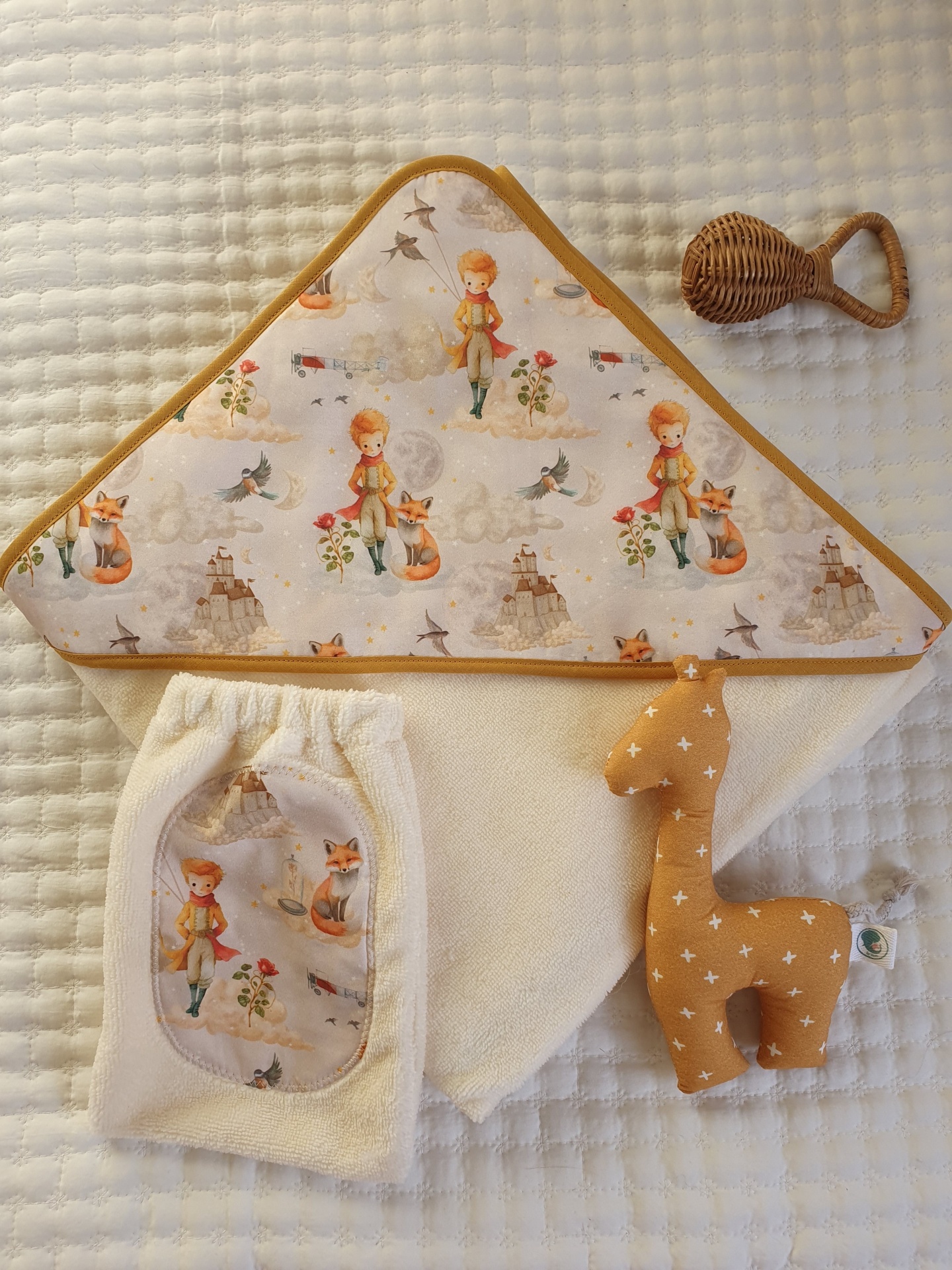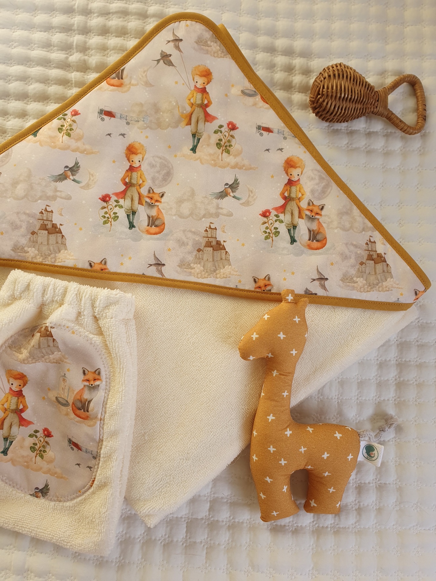 • Conjunto de toalha de banho triangular com padrão do Pequeno Príncipe, fralda branca com bolso estampado e brinquedo de peluche girafa castanho