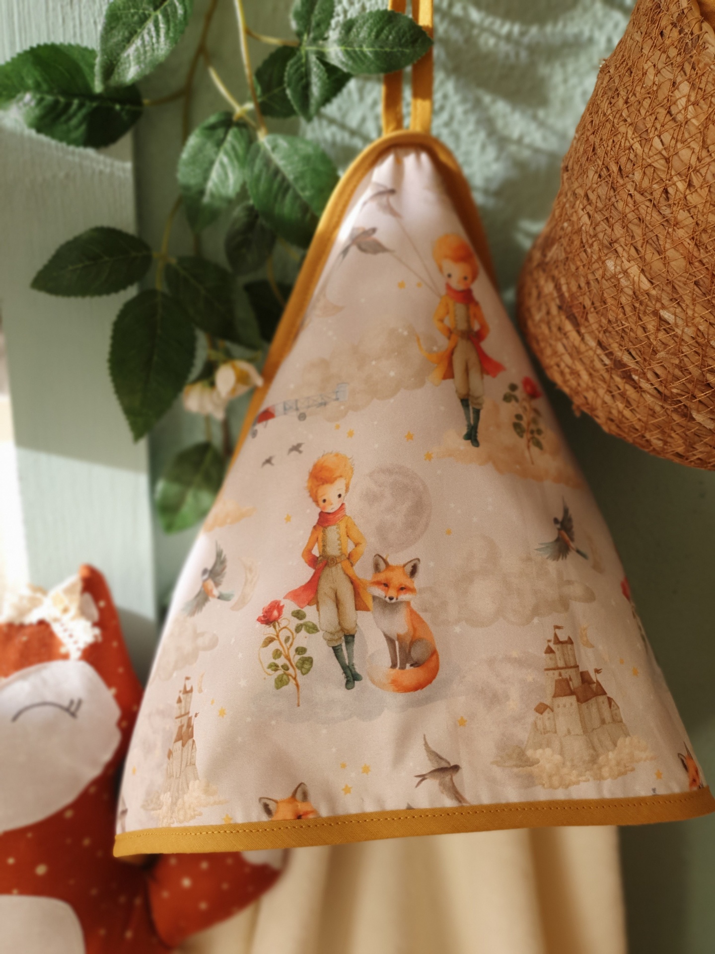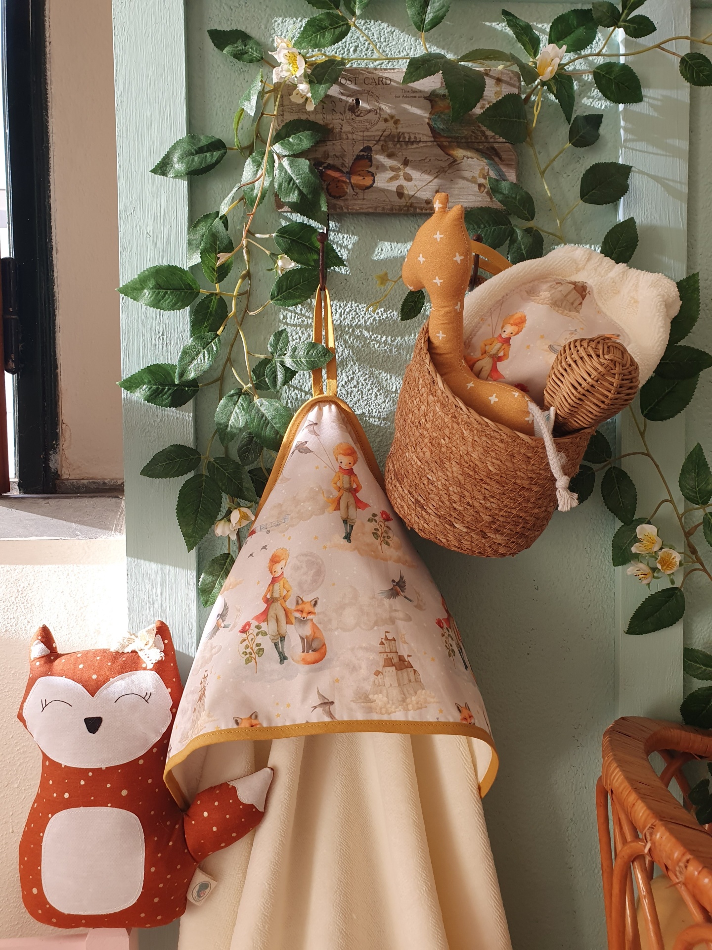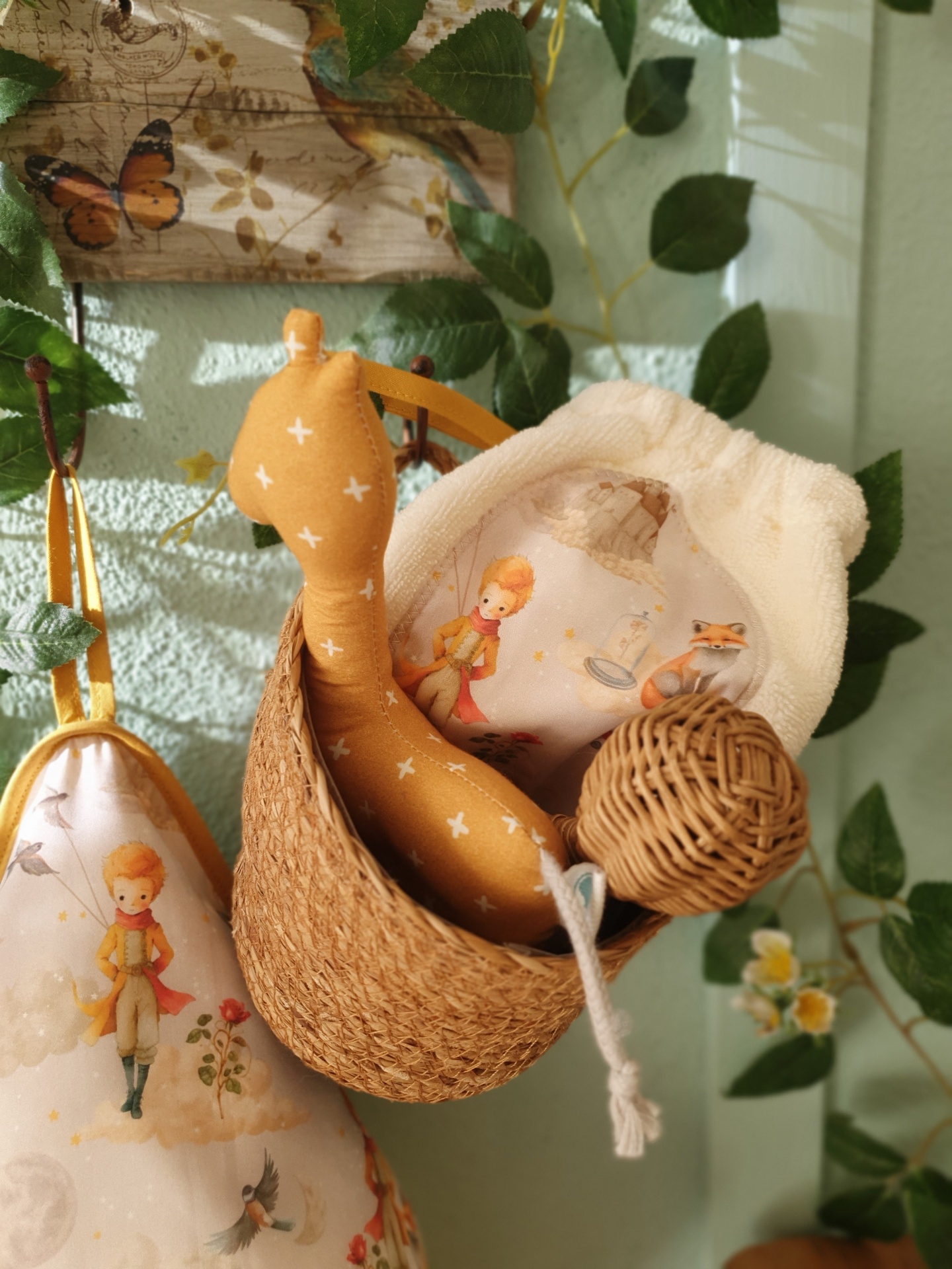 • Avental com padrão do Pequeno Príncipe e boneco de girafa de tecido em cesta de palha suspendida
